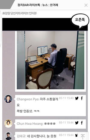 생방송은 메신저와 결합돼 ‘라이브 톡’으로 재탄생되기도 한다. 한겨레 정치팀의 ‘정치BAR’가 개발한 라이브 톡은 인터뷰어와 인터뷰이가 메신저를 통해 대화하는 새로운 포맷의 인터뷰다. 오픈채팅방도 나란히 열려 네티즌이 인터뷰 대상자에게 궁금한 점을 직접 질문할 수 있다. 한겨레 김원철 기자는 “날 것 그대로의 인터뷰를 보여주자는 취지로 기획하게 됐다”며 “카메라보다 메신저가 시공간의 제약을 넘어서 자유롭게 의견을 표현할 수 있다고 생각했다. 독자들이 정치인을 민낯으로 만날 수 있는 기회”라고 전했다.