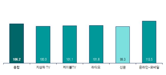 매체별로 살펴보면 지상파TV 100.0, 케이블TV 101.1, 라디오 101.8, 신문 99.3, 온라인-모바일 113.5로 나타났다.