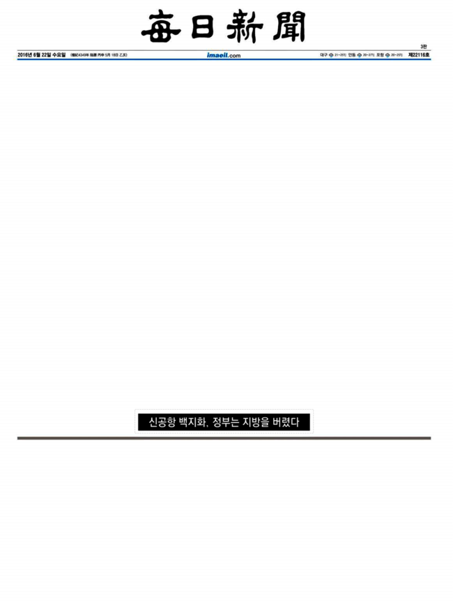 대구·경북 지역 매체 매일신문이 22일자 1면 전면을 백지로 냈다. 정부가 영남권 신공항 건설을 백지화한 데에 대한 항의 표현이다.