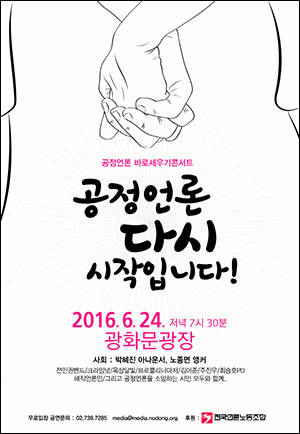 전국언론노동조합(위원장 김환균)이 오는 24일 오후 7시30분 서울 광화문광장에서 <공정언론 바로세우기 콘서트-공정언론 다시 시작입니다!>를 개최한다.