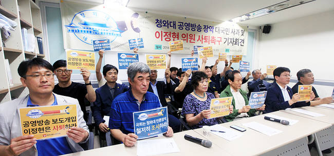 전국언론노동조합(위원장 김환균) 등 7개 언론시민단체들은 지난달 30일 오후 서울 중구 한국프레스센터에서 긴급 기자회견을 열고 세월호 참사 당시 청와대 홍보수석이던 이정현 새누리당 의원이 김시곤 전 KBS 보도국장에게 연락해 보도에 직접 개입한 사실을 드러내는 음성녹취를 공개했다.