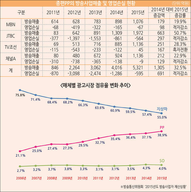 반면 종편은 2011년 출범 이래 지속해 온 고속성장세를 2015년에도 이어갔다. 2011년 846억, 2012년 2264억, 2013년 3062억, 2014년 4016억원으로 성장해 온 종편 4사의 방송매출은 2015년에도 1305억원(32.5%) 증가한 5321억원을 기록했다. 이는 광고매출이 2229억원에서 2863억원으로, 협찬매출이 934억원에서 1345억원으로 증가한 데 따른 것이다.