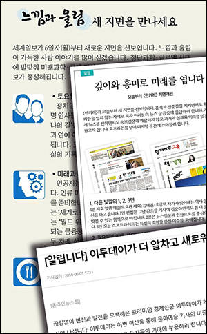 세계일보도 지난달 초 지면개편에 나섰다. 사람, 첨단·미래과학, 국제기사를 늘리고 레저·음식, 재테크 기사를 강화했다. 매주 토요일 정치·경제·사회·문화·스포츠 등 각 분야 전문가와 저명인사의 삶을 들여다보는 ‘나의 삶 나의 길’ 등을 통해 사람 이야기에 주목하고 있다.