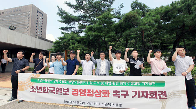 분회는 이와 함께 지난 4일 장 대표를 특정경제범죄법상 횡령과 노동관계조정법 상 부당노동행위 등으로 검찰에 고발했다. 분회는 이날 서울중앙지검 앞에서 기자회견을 열고 “장 대표가 자신이 실질적 대표였던 광릉레저개발(광릉CC) 등으로부터 소년한국일보가 20여억원의 거액을 대출받도록 한 뒤 이를 가지급금 방식으로 가져가 소년한국일보와는 무관한 곳에 사용하는 등 업무상 배임 혐의가 있다”고 밝혔다. 또 “그간 무책임한 경영을 일삼아 온 경영진이 이제라도 소년한국일보의 경영 정상화를 위해 잘못을 인정하고 책임 있는 자세를 보여줘야 한다”고 촉구했다.