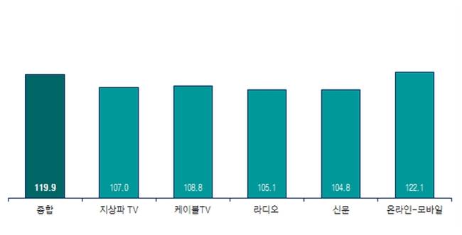 매체별로는 지상파TV 107.0, 케이블TV 108.8, 라디오 105.1, 신문 104.8, 온라인-모바일 122.1로 나타났다.