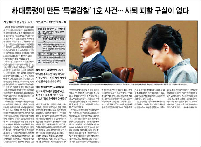 조선은 지난 19일 ‘박 대통령이 만든 특별감찰 1호 사건…사퇴 피할 구실이 없다’란 제목의 기사를 통해 “사정라인의 총괄 직위를 유지한 채 수사 받는 건 비상식적”이라며 우 수석의 사퇴를 촉구했다. 조선은 같은 날 사설에서 “일부 언론에 노출돼 보도된 SNS 메모는 이미 다 알려진 내용으로, 감찰 정보 누설이라고 보는 건 억지”라며 “훨씬 중요한 것은 어떤 경로로 언론에 유출됐느냐는 점이다. 만일 국가기관에 의한 불법 해킹으로 이뤄진 거라면 언론 취재 활동을 침해한 것이고, 정권 차원의 스캔들로 번지게 될 것”이라고 지적했다.