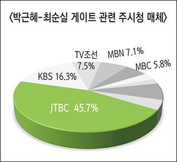 박근혜-최순실 게이트 관련 뉴스를 시청하는 채널은 주로 종편이었다. 종편 JTBC가 45.7%로 가장 높았고 그 뒤로 KBS 16.3%, TV조선 7.5%, MBN 7.1%, MBC 5.8%, SBS 3.2%, 채널A 2.3% 순이었다.