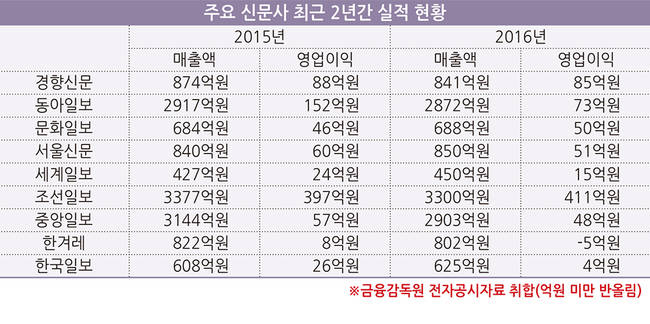 실적 부진의 원인은 각 사마다 다소 차이가 있지만 신문 산업을 지탱해 온 수익의 양대 축인 광고·협찬, 지대 등의 매출이 악화된 데 따른 여파로 풀이된다.