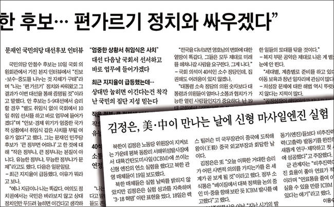 실제로 지난 11일자 5면 <安 “나는 유능한 후보…편가르기 정치와 싸우겠다”>는 기사는 안철수 국민의당 대선후보를 인터뷰한 본문 내용과 달리 중간 제목엔 ‘문재인 국민의당 대선후보 인터뷰’로 나갔다. 앞서 지난달 20일자 1면 제목엔 <김정은, 美·中이 만나는 날에 신형 마사일엔진 실험>으로 나갔는데 이 역시 ‘미사일’을 잘못 표기한 경우다.