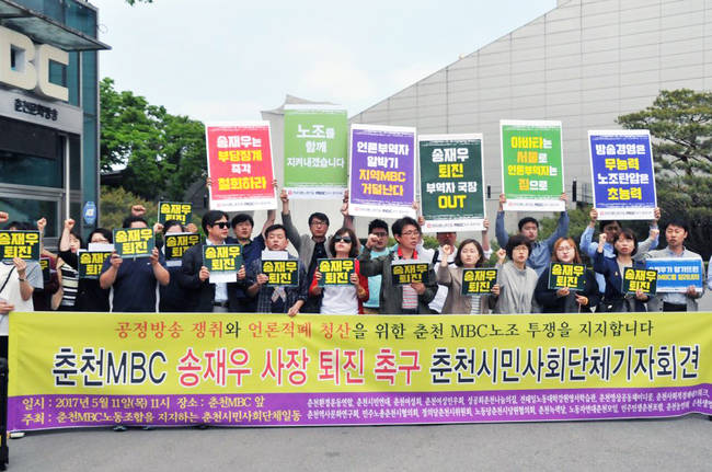 이날 춘천지역 13개 시민단체 역시 춘천MBC 앞에서 기자회견을 열고 송 사장 퇴진과 함께 춘천MBC 노조 파업 지지의사를 천명했다.