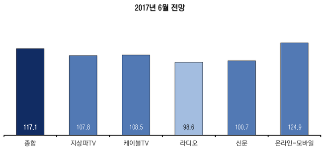 코바코가 국내 광고시장의 경기변동을 파악하기 위해 조사·발표하고 있는 ‘광고경기예측지수(KAI·Korea Advertising Index)’에 따르면 6월 종합 KAI는 117.1로 나타났다.