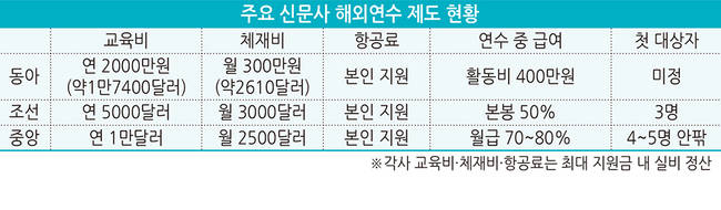 중앙도 체재비 월 2500달러, 학비 연 1만달러 이내 지원 방침을 세운 한편 내년부터 기자뿐 아니라 PD, 디지털·경영 직군까지 해외연수 문호를 확대한다는 방침이다.