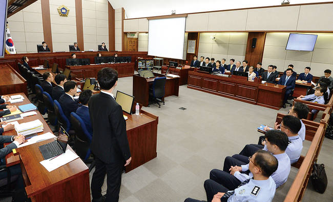 오후 2시10분, 311호 중법정. 방청석과 뒤쪽으로 마련된 44석의 기자석이 대부분 차자 이윽고 재판부가 입정해 선고를 시작했다. 재판장이 판결이유를 읽어 내리는 동안 타자를 치는 소리가 따라 붙었다. 피고인을 조금 더 가까이서 보려고 줄까지 서 방청석에 섞여 앉은 몇몇 기자들은 한 글자라도 못 들을까 집중한 얼굴로 타자를 두들겼다. 카카오톡 대화방에 실시간으로 전송된 내용은 곧 속보가 됐다. 이날 재판부는 조윤선 전 문화체육관광부 장관을 제외한 이들에게 모두 실형을 선고했다.