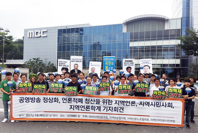 한국지역언론학회, 지역방송협의회, 지역신문노조협의회, 지역민주언론시민엽합은 지난달 28일 오후 대전MBC 사옥 앞에서 고대영 KBS 사장과 김장겸 MBC 사장, 이진숙 대전MBC 사장의 사퇴, 지역 방송·신문 지원제도 정상화 등을 요구했다.