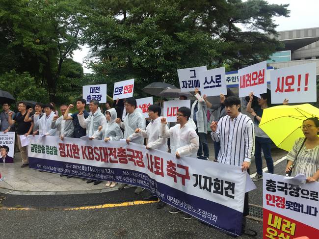 KBS노동조합 대전충남지부, 언론노조KBS본부 대전충남지부, 국민주권실현 적폐청산 대전운동본부, 대전충남언론노조협의회는 16일 KBS대전방송총국 사옥 앞에서 기자회견을 열고 "언론부역자 정지환 총국장은 자진 사퇴하라"고 목소리를 높였다.