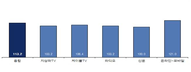 매체별 KAI지수를 살펴보면 지상파TV 103.2, 케이블TV 106.4, 라디오 103.2, 신문 100.0, 온라인-모바일 121.0으로 조사됐다.