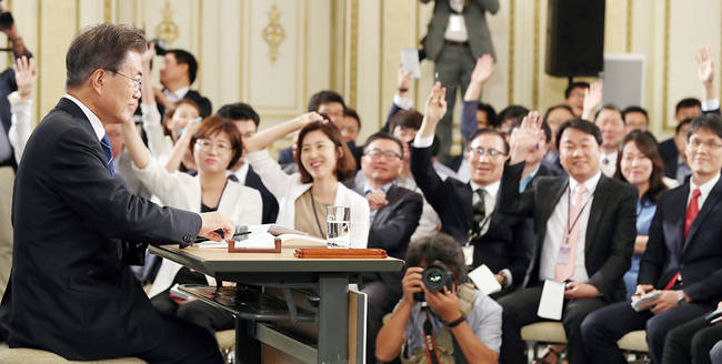 “기자생활 10여년 만에 처음 보는 광경이었다.” 지난 17일 문재인 대통령 취임 100일 기자회견에 참석했던 한 일간지 A 기자는 질문 기회를 얻으려 기자 수십명이 동시에 손을 드는 모습이 낯설었다고 했다. 그는 “기자들도 대통령과의 소통이 고팠던 것”이라며 “박근혜 정부 당시 청와대는 구조적 한계가 많았고 기자들은 질문하지 못해 비판받았다. 문 대통령의 기자회견은 전임 정부, 그때 기자들과 완전히 다른 이미지를 줬다”고 말했다.