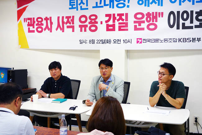 이 같은 상황에서 22일 이인호 이사장이 관용차를 사적으로 유용했다는 문제제기까지 나오며 KBS 안팎이 들끓고 있는 상태다. 새노조는 이날 기자회견에서 “이인호 이사장이 재임기간 중 최소 500여 차례에 걸쳐 관용차를 사적으로 이용한 사실을 확인했다”며 “고대영 KBS사장은 근거규정도 없이 비상임인 이사장에게 관용차를 제공했고, 이사장의 사적유용을 충분히 알 수 있었음에도 이를 묵인했다”고 주장했다. 이어 업무상 배임과 김영란법 위반 가능성을 언급했다.