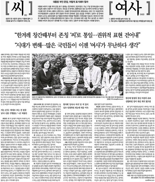 한겨레가 대통령 부인 호칭 표기를 ‘씨’에서 ‘여사’로 변경하기로 했다. 새 정부 출범 이후 대통령 부인 호칭 문제가 지속적으로 논란이 됨에 따라 더는 독자들과 대립하지 않기 위한 조치로 풀이된다.