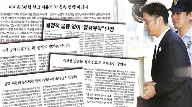 반면 중앙일보는 26일자 뉴스분석에서 “유죄 근거로 ‘정경유착’을 내세웠지만 이를 입증할 결정적 물증은 끝내 없었다”며 “기업이 권력의 강압적 요구를 거스르기 어려운 현실적 상황도 고려되지 않았다”고 지적했다. 한국경제는 사설에서 “이미 정치권과 여론재판으로 중형을 선고한 마당에 재판부에 독립적인 판단을 기대하는 것부터가 무리였는지도 모른다”며 “무죄추정 원칙, 증거재판주의 등 사법의 기본원칙이 설 자리도 없었다”고 비판했다.