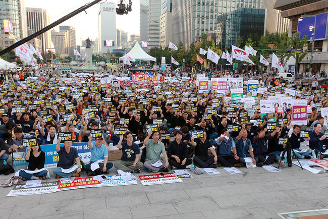 지난 8일 저녁 5시30분. 서울 광화문 세종문화회관 앞에서 열린 ‘KBS MBC 공동파업 언론노조 결의대회’. KBS MBC본부 조합원 5000여명 참석. 지난해 박근혜 정권을 끌어내리기 위해 국민들이 촛불을 든 곳에서 언론인들이 적폐인사의 사퇴를 요구하기 위해 또다시 광장에 모인 뜻깊은 날.