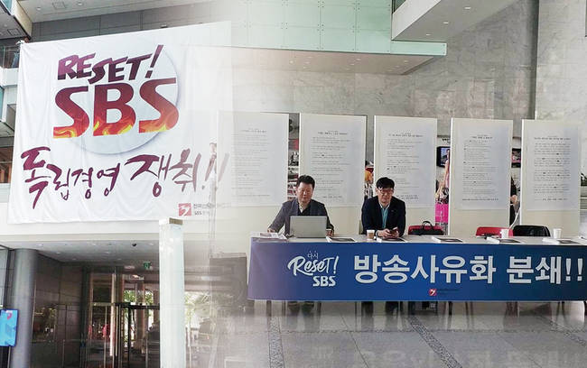 박근혜 정부 당시 보도지침을 내렸다는 의혹을 받아온 윤세영 회장 일가가 지난 11일 갑작스럽게 사임했다. 하지만 전국언론노조 SBS본부는 윤 회장의 사임이 진정성이 없는 재탕, 삼탕의 쇼에 불과하다며 형사 고발을 검토하고 있다. 또 지난주부터 사옥 로비에 부스를 차리고 ‘RESET! SBS! 독립경영 쟁취!!’가 써진 대형 플래카드를 내걸었다.