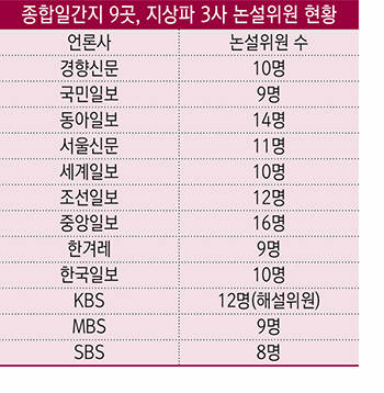 종합일간지 9곳과 지상파 3사의 논설위원 현황을 살펴본 결과 중앙일보가 16명으로 가장 많았다. 중앙일보 논설위원실에는 이들 외에도 편집국 보직과 논설위원을 겸하는 4명, 칼럼리스트 3명도 속해 있다.