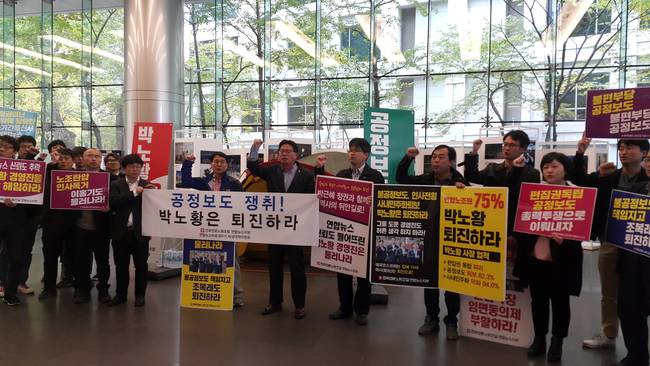 비대위는 이날 기자회견에서 "박노황 경영진이 초래한 연합뉴스의 위기는 더욱 커지고 있다"며 "박노황 사장과 함께 연합뉴스 공정보도 쟁취 103일 파업을 초래한 핵심 인사인 김성수 전 편집상무가 뉴스통신진흥회 제5기 이사에 선임되기 위해 정치권을 기웃거리고 있다"고 지적했다.