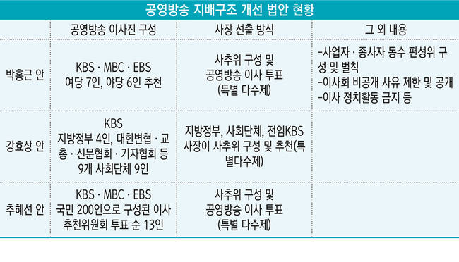 현 논의에서 일종의 원안이 되는 ‘박홍근 안’은 ‘방송법’, ‘방송통신위원회 설치법’, ‘방송문화진흥회법’, ‘한국교육방송공사법’ 등 네 개정안의 패키지로, 소위 ‘언론장악 방지법’으로 불린다. KBS 이사회와 방송문화진흥회 이사 수를 13명으로 통일하고, 추천 주체를 현 방송통신위원회에서 ‘국회(여야 7대6)’로 바꿨다. 그 외 사장 임면 시 특별다수제(재적이사 3분의 2이상) 도입 및 사장추천위원회 구성, 노사동수편성위원회 설치와 벌칙을 명문화했다.