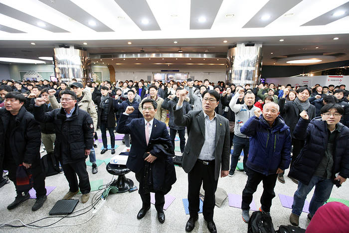 공영방송 정상화 파업을 121일째 이어오고 있는 언론노조 KBS본부 조합원들은 2일 서울 여의도 KBS본관 민주광장에서 새해 첫 집회를 열고 조속한 고대영 사장·이인호 이사장 퇴진 등을 촉구했다. (사진=언론노조)