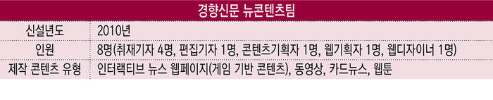 경향신문 뉴콘텐츠팀은 신문기사를 넘어서 인터랙티브 뉴스 웹페이지, 동영상, 카드뉴스, 웹툰 등 다양한 콘텐츠를 제작하는 팀이다. 전신은 2010년에 탄생한 인터랙티브팀으로, 이후 미디어기획팀, 미래기획팀을 거쳐 지난해 7월 뉴콘텐츠팀으로 변모했다. 4명의 취재기자뿐만 아니라 웹디자이너, 기획자 등 다양한 인력이 모여 있는 팀이기도 하다. 현재 팀장 포함 8명의 인력이 일하고 있고 3명은 실제 디지털 콘텐츠 기획과 제작을, 나머지는 SNS 운영, 뉴미디어 동향 연구, 전략 수립 등을 하고 있다. 3명의 제작 인력은 기획, 디자인, 퍼블리싱 등의 역할을 따로 또 같이 하며 경계를 넘나드는 협업을 하고 있다.