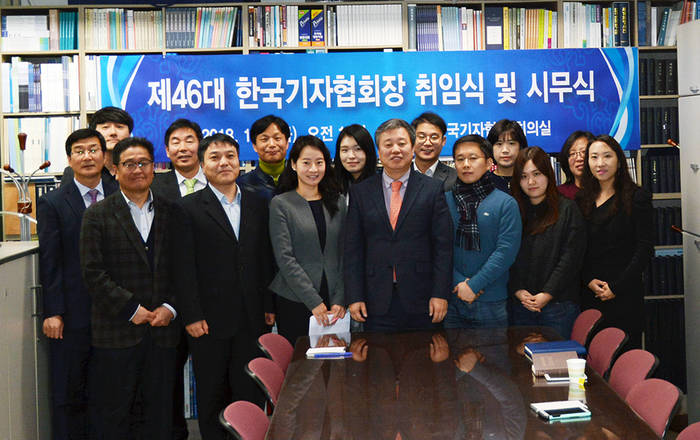 2일 서울 세종대로 한국프레스센터 13층 한국기자협회 사무실에서 제46대 한국기자협회장에 취임한 정규성 회장(앞줄 가운데)과 기자협회 직원들이 시무식을 가졌다.