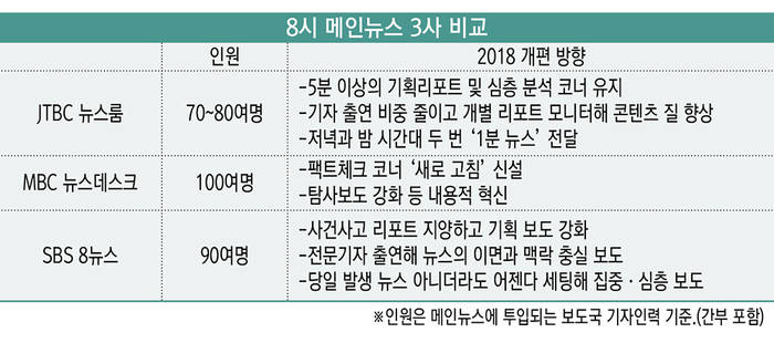 먼저 3사 모두 기획과 탐사보도를 늘리자는 데 방점을 두고 있다. 기존에 1분30초짜리 스트레이트 기사 중심의 ‘백화점식 보도’를 탈피하고 ‘이슈 중심’으로 보도하겠다는 뜻이다. JTBC 뉴스룸은 이미 지난 2013년 손석희 보도담당 사장이 온 뒤 5분 이상의 기획리포트와 심층 분석 코너를 신설해 파격적인 뉴스 형식을 선보였다. 리포트당 2분을 넘기면 시청자들이 채널을 돌려버린다는 기존의 상식을 뛰어넘은 혁신이었다.