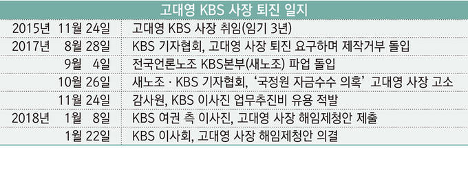 고대영 KBS 사장이 해임됐다. 지난해 9월4일 고대영 사장 퇴진을 외치며 KBS 구성원들이 총파업에 돌입한 지 142일 만이다. 고 사장의 해임제청안은 지난 22일 열린 KBS 임시이사회에서 찬성 6표, 기권 1표로 의결됐다. 23일엔 문재인 대통령이 해임제청안을 재가함으로써 고 사장은 24일 0시부로 KBS 사장직에서 물러나게 됐다.