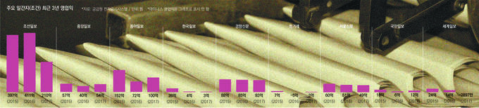 2014년 이후 꾸준히 400억원 규모의 영업이익을 내던 조선일보는 지난해 반으로 뚝 떨어졌다. 조선일보의 한 기자는 “신문 산업이 5년 내 무너질 거라는 걸 몸소 체감할 정도다. 1등 신문이 이 정도면 다른 중소형 신문사는 말할 것도 없을 것”이라고 말했다.