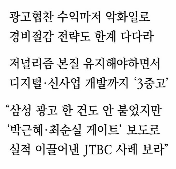 중앙일보의 한 기자는 “세월호와 ‘박근혜-최순실 게이트’ 보도 등으로 주목받은 JTBC의 경우 채널 이미지 개선으로 전 부문의 시청률이 오르지 않았나. 보도의 성공이 실적으로 이어질 수 있다는 것을 보여준 사례”라고 설명했다. 실제로 JTBC는 지난해 하반기에 삼성광고가 한 건도 붙지 않았지만 매출액 3111억원, 영업이익 98억원의 의미있는 성과를 냈다.