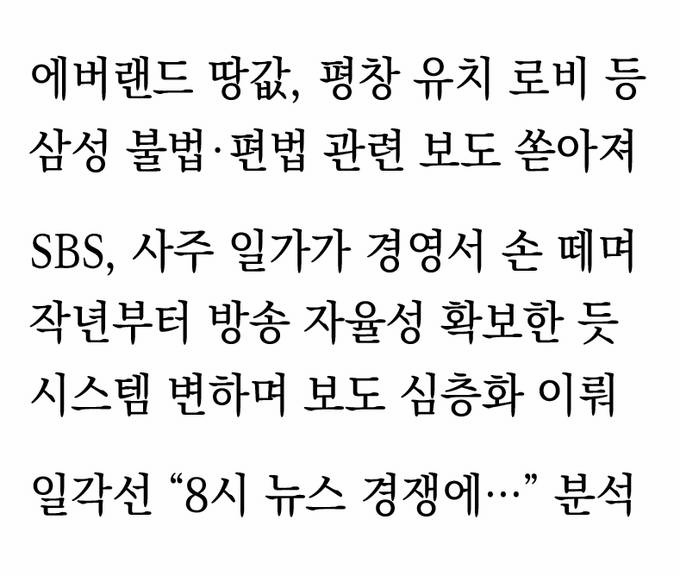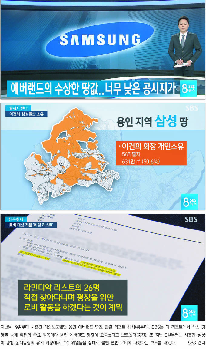72개. SBS가 지난 한 달간 내보낸 삼성 관련 리포트 개수다. SBS 탐사보도부는 지난달 19일부터 사흘에 걸쳐 삼성 경영권 승계 작업의 주요 길목에서 용인 에버랜드 땅값이 요동쳤던 정황을 집중보도했다. 지난 9일부터는 정치부가 사흘간 삼성이 평창 동계올림픽 유치 과정에서 IOC 위원들을 상대로 불법·편법 로비에 나섰고 이것이 이건희 회장의 특별사면과 관련이 있다는 보도를 내놨다. 삼성의 노조 와해 의혹, 삼성증권 배당 오류 사태까지 더하면 최근 SBS ‘8뉴스’에선 매일같이 삼성 리포트가 보도됐다.