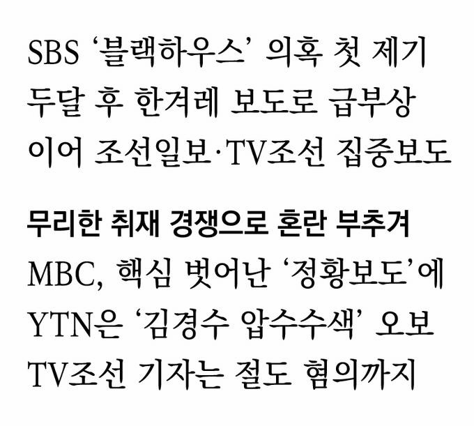 취재 과열 속에서 지난 19일에는 김 의원이 경남지사 출마 선언을 취소하자 ‘불출마’ 관측과 함께, ‘압수수색 오보’(YTN) 해프닝이 빚어졌다. 팩트 확인을 하지 않고 최초 보도를 한 YTN의 기사를 받아쓴 언론사들이 줄줄이 오보를 낸 것이다. 지난 23일에는 TV조선의 A기자가 무단침입 및 절도 행위로 논란을 일으키며 사과 방송까지 했다.