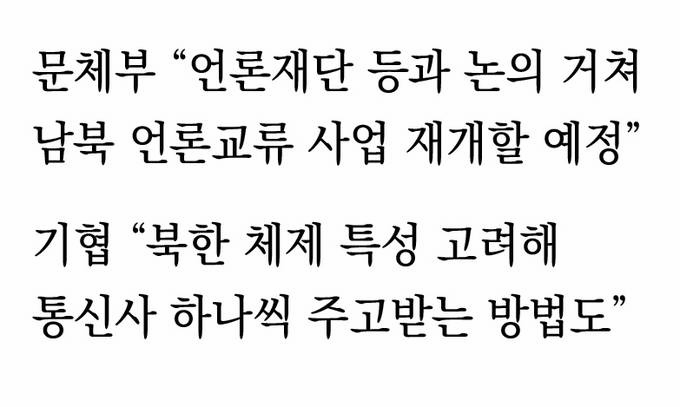 당장 문화·예술계 교류 사업은 탄력을 받고 있다. 정부 주무 부처인 문화체육관광부는 지난 1월 꾸린 ‘남북문화교류협력특별전담반 태스크포스(TF)’를 최근 개편해 1차관이 총괄을 맡고 주기적으로 현안을 점검하기로 했다. TF에선 정상회담 후속조치로 관련 사업을 재개할 방침인데 이 중에는 언론교류도 포함돼 있다. 황성운 문체부 대변인은 “언론교류도 중요한 카테고리 중의 하나로 생각하고 있기 때문에 차근차근 준비할 예정”이라며 “한국언론진흥재단(언론재단) 등과 논의해 교류 사업을 재개할 예정”이라고 말했다.