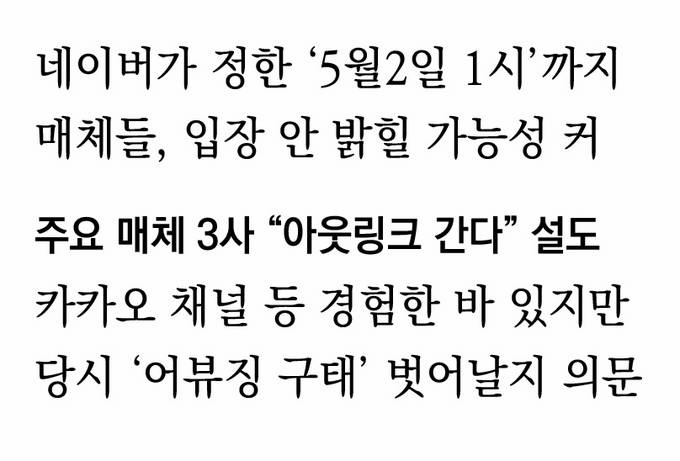 차제에 탈 포털을 꾀하는 언론도 나올 것으로 보인다. ‘아웃링크로 간다’는 2~3개 주요 매체명이 돌고, “전재료 안 받아도 상관 없다”는 자신감을 표하는 매체도 있다. 언론이 네이버에 문제제기한 ‘댓글’ 관리 등에 대한 대비는 돼 있는지, 포털이 아웃링크를 허용했던 네이버 뉴스캐스트, 카카오 채널 등 당시 언론의 ‘어뷰징’ 행태와 다른 모습을 보일 수 있을지 회의적으로 보는 시선도 많다.