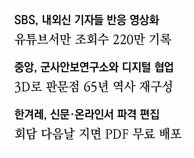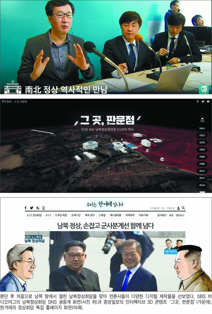 과거 두 차례의 남북정상회담은 북측에서 열린 탓에 취재와 기사 송고 등 상당 부분이 제한될 수밖에 없었다. 처음으로 남쪽 땅에서 열린 이번 정상회담은 모든 경계를 허물었다. 방송은 회담 당일 새벽부터 밤늦게까지 속보 체제를 가동하며 실시간으로 소식을 전했고, SNS 등을 통한 라이브 중계와 콘텐츠 공유도 활발하게 이뤄지며 디지털 세계 독자들을 사로잡았다.