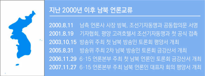본격적인 시작은 2000년 6·15 정상회담이 치러진 뒤에야 이뤄졌다. 남북 정상회담 직후 남측 언론사 사장단이 방북해 조선기자동맹 중앙위원장과 △비방 중상 금지 △협력과 교류 등 공동합의문에 서명했고, 2001년 8월19일엔 ‘2001 민족공동행사 남측추진본부’ 대표단 일원으로 북한을 방문한 기자협회 관계자들이 평양 고려호텔에서 조선기자동맹 대표단과 분단 이후 첫 공식 회담을 가졌다. 남북 대표단은 이 자리에서 △남북 공동의 보도준칙 마련 등 기자교류 △연합뉴스와 조선중앙통신과의 기사교류 방안 등을 공식적으로 논의했다.