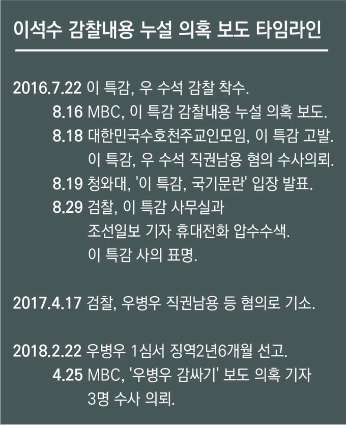 지난 2016년 8월16일. MBC 뉴스데스크에서 단독 보도가 나왔다. <이석수 특별감찰관, 감찰 상황 누설 정황 포착>의 리포트에는 당시 우병우 청와대 민정수석을 수사하던 이석수 특별감찰관이 모 언론사 기자에 감찰 내용을 유출했다는 내용이 담겼다. MBC는 입수한 SNS 내용을 전하며 “특별감찰법은 감찰 내용의 외부 누설을 금지하고 있으며 위반할 경우 5년 이하의 징역 또는 5년 이하의 자격정지에 처한다”고 위법 가능성을 제기했다.
