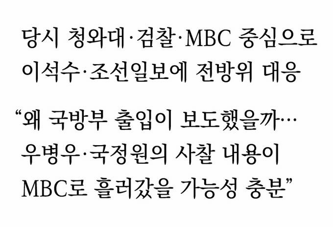 여기에 당시 MBC 정치부장이었던 A 씨와 우 전 수석이 서울법대 84학번 동기 사이인 게 알려지며 ‘사찰 가능성’에 힘이 실렸다. MBC 내부에서는 당시 통화내용 메모를 들고 나타난 게 A 부장이며, 청와대를 출입한 B 기자와 국방부에 출입한 C 기자의 합작품이라는 추측이 나돌았다. 실제로 우 전 수석과 MBC 기자가 해당 보도를 전후해 집중적으로 전화 통화를 한 사실이 추명호 전 국가정보원 국익정보국장의 재판 과정에서 드러났다.