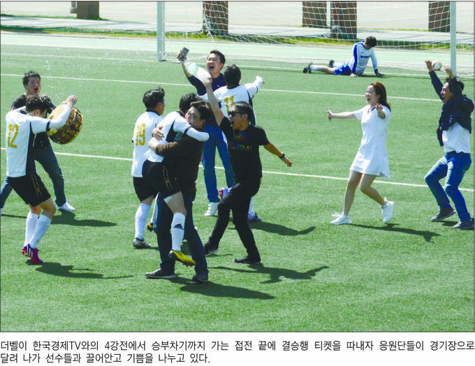 더벨은 6년 만에 4강 진출에 성공한 뒤 내친 김에 결승까지 올라 준우승을 따냈다. 특히 한국경제TV와의 4강전에서 경기 종료 직전 터진 극적인 동점골은 이날 경기의 백미였다. 한형주 선수의 발을 떠난 슛이 골망을 흔드는 순간, 응원단까지 경기장으로 달려 나가 서로를 끌어안았다. 지난해 대회에서 쇄골을 다쳐 수술을 한 뒤 최근에야 철심을 빼냈다는 한형주 기자는 경기 도중 수술 자국이 터져 치료를 받으면서도 웃음을 잃지 않았다.