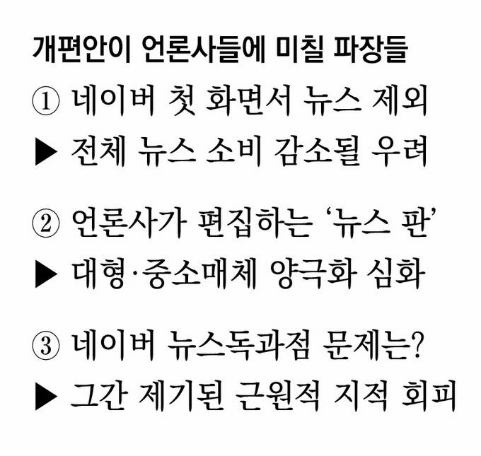언론사 간 입장을 떠나 이번 개편안이 네이버의 뉴스시장 독과점 등 그간 언론계가 제기한 근원적인 지적을 비껴간 대책이란 지적이 나온다. ‘이용자’를 최우선으로 강조해 온 네이버의 노선과 맞지 않는다는 비판도 있다.