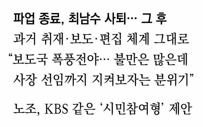 최 전 사장이 퇴진하며 정상화의 물꼬는 트였지만 공정방송 실현을 위해선 아직 갈 길이 멀다. YTN 보도참사의 장본인으로 꼽히는 내부 인사들은 여전히 자리를 지키고 있다. 기자들을 무기력하고 수동적으로 만드는 과거의 취재-보도-편집 체계도 그대로다. YTN의 한 기자는 “보도국은 폭풍전야다. 파업이 끝났고 최 사장은 사퇴했지만 적폐 인사들이 계속 자리를 차지하고 있는 상황에서 근본적인 문제가 해결됐다고 보는 사람은 아무도 없다”며 “다들 불만이 많은데 새 사장 선임 때까지 지켜보자는 분위기”라고 전했다. 또 다른 기자도 “크게 달라진 건 없지만 파업에 참여했던 기자들과 참여하지 않았던 보직 부장들 사이가 데면데면해졌다”며 “차차 내부 갈등을 봉합해가겠지만 새 사장으로 개혁적인 인물이 오지 않는다면 이런 상황이 계속될 것”이라고 말했다.