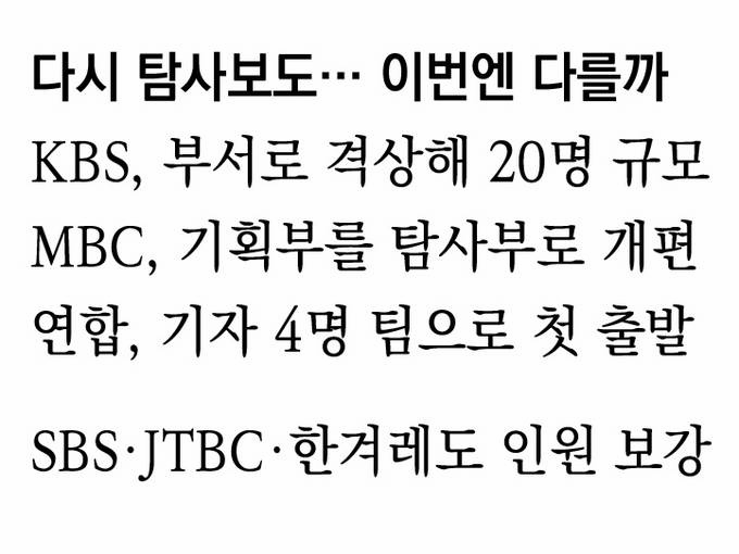기존에 탐사팀을 운영하던 언론사들도 인원을 늘리는 등 확대 개편에 나섰다. 한겨레는 지난달 기존에 탐사보도를 담당하던 디스커버팀에 이어 탐사팀을 추가로 신설하고 기자를 각각 3명씩 배치했다. 박용현 신임 편집국장이 취임 일성으로 내세운 ‘탐사와 현장성 강화’를 반영한 결과다. 한겨레는 또 여건이 되는 대로 경력 기자를 채용해 3번째 탐사팀을 만들 예정이다. 이재성 탐사에디터는 “탐사 콘텐츠 관련 인원 규모로는 역대 최대”라고 말했다.