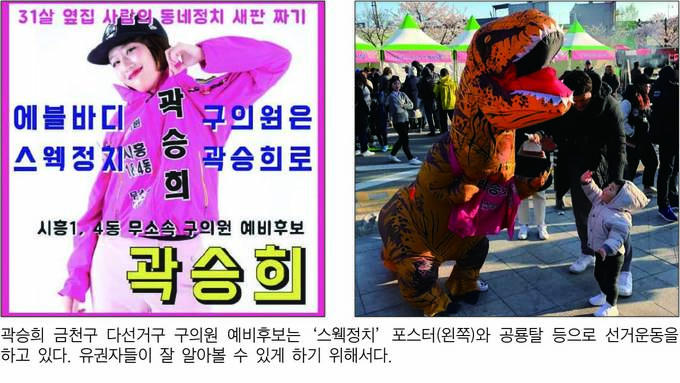 ‘에블바디 스웩정치, 구의원은 곽승희로.’ 서울 금천구 시흥사거리 정류장에 내리면 이 문구와 함께 힙합 가수 같은 포즈를 취하고 있는 곽승희 후보의 현수막을 볼 수 있다. 대부분 지방선거 현수막이 ‘지역의 새희망’ ‘00구를 살리겠다’ 같은 문구나 단정한 자세로 찍은 사진으로 제작되는 것과는 사뭇 다르다. 곽승희 서울 금천구 다선거구 구의원 예비후보는 “유권자들이 저를 알아볼 수 있게 일부러 발랄한 콘셉트로 사진도 찍고 현수막도 만들었다”며 “평소 선거운동 할 때도 공룡 탈, 머리띠를 쓰거나 팻말을 걸고 다닌다. 지방선거에서 20~30대 투표율이 낮은데 최대한 젊은 사람들의 눈을 돌리게 만들고 싶었다”고 말했다.