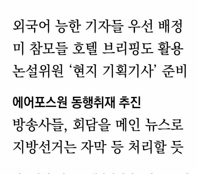 MBC를 비롯한 일부 언론사들은 트럼프 대통령의 싱가포르행 에어포스원에 동행취재를 추진 중이다. 비용은 1인당 3만불로, 카메라기자까지 합치면 6만불이 든다. 어느 언론사가 동행을 하게 될지의 여부는 미 국무부에서 심사를 통해 선정된다. MBC는 하루 1000만원에 이르는 싱가포르 현지 호텔 카페 섭외도 마쳤다. 박성제 취재센터장은 “취재기자 7~8명을 포함해 15명 안팎의 취재진이 현지에 갈 예정이다. 메인앵커인 박성호 기자가 갈지 여부는 아직 확정되지는 않았다”며 “12일로 회담 일정이 끝나면 13일에 선거방송 위주로 치를 수 있겠지만, 후속보도가 나오면 선거방송 부분이 축소될 가능성이 있다”고 했다. 박 센터장은 “출구조사 발표는 하고 메인뉴스는 북미회담 위주로 가면서 개표 소식들은 하단으로 돌리는 방식”이라고 덧붙였다.